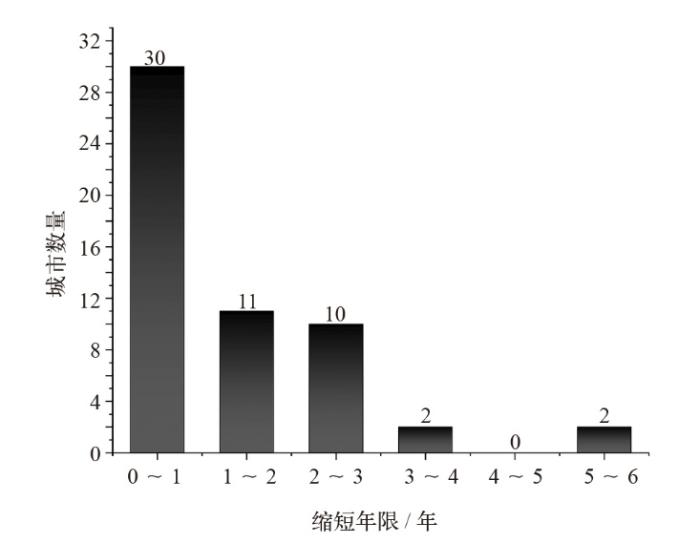 注:图为绿证核发前DPBP<25年的城市(共55个城市)的缩短年限分布。